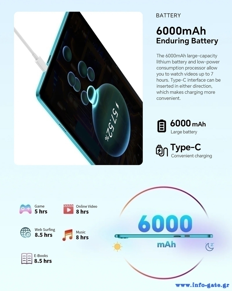 Η μπαταρία χωρητικότητας 6000mAh προσφέρει μεγάλη αυτονομία που θα σας απαλλάξει από τις συχνές αναζητήσεις τροφοδοσίας.
