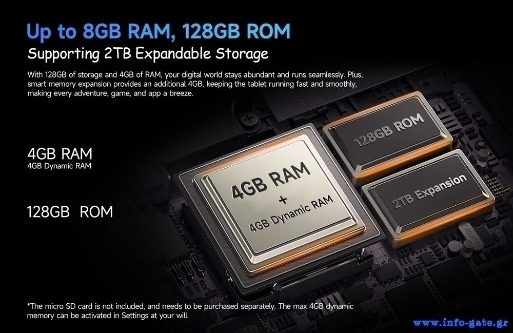 Με 4GB (+4GB virtual) RAM και 128GB ROM για να αποθηκεύετε τα αγαπημένα σας αρχεία, φωτογραφίες και βίντεο. Επιπλέον, προσφέρει την δυνατότητα να επεκτείνετε τον χώρο αποθήκευσης του tablet με κάρτα micro SD έως 2TB.