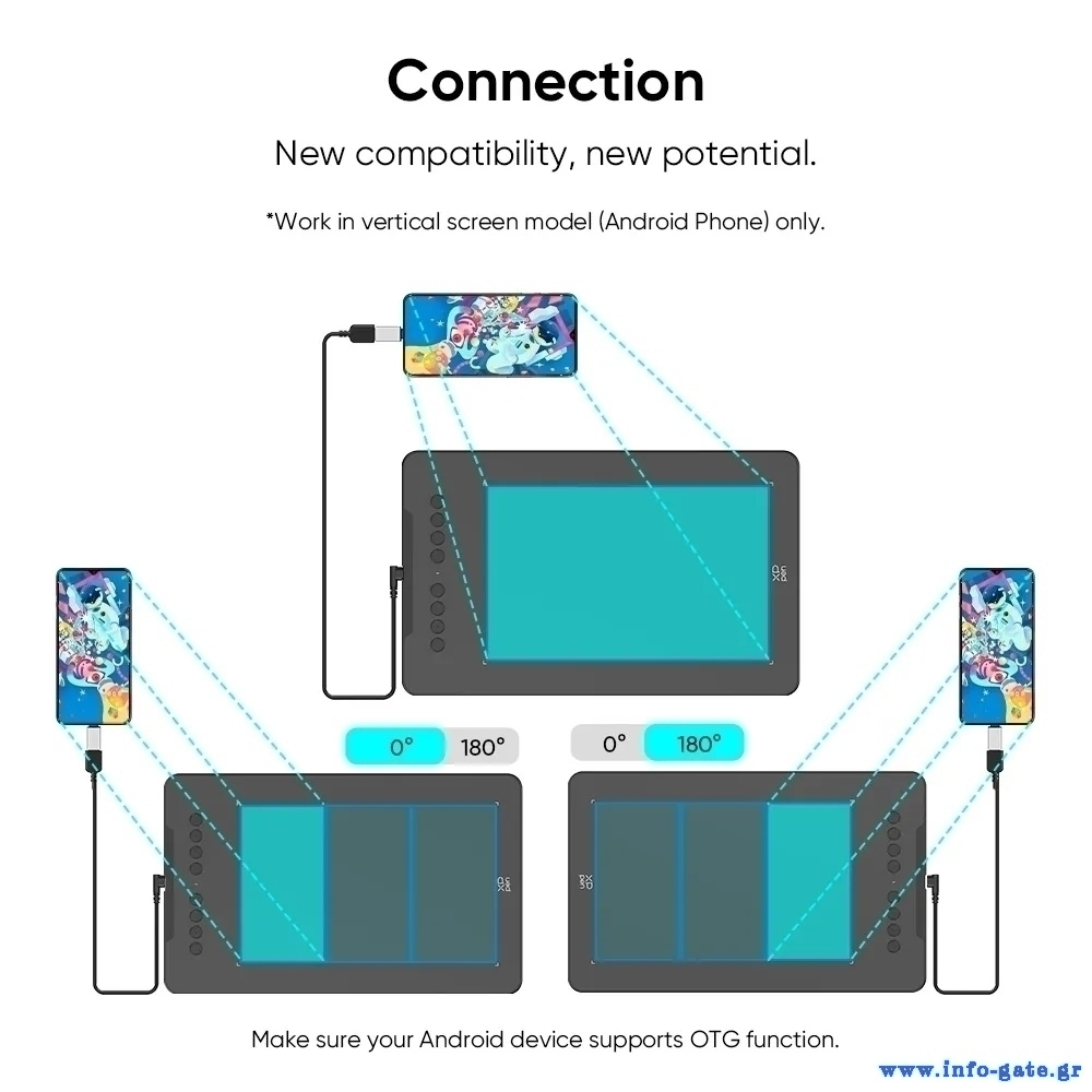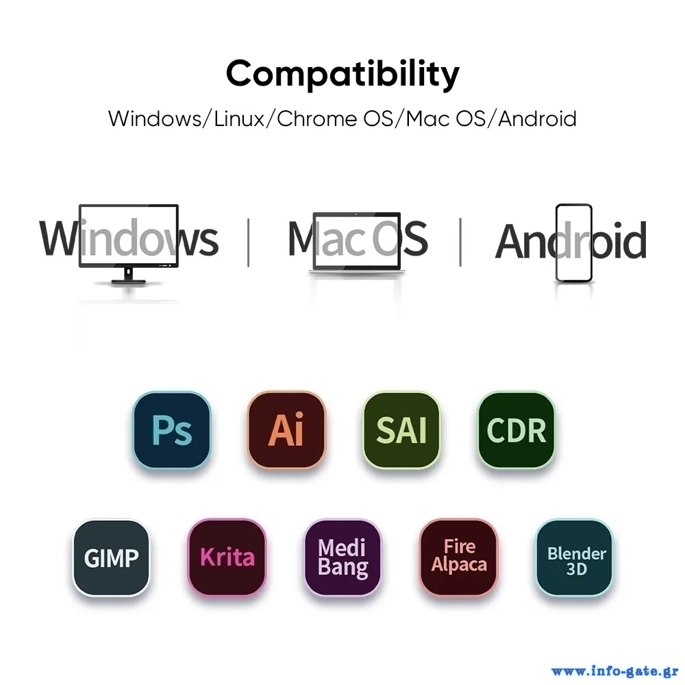 Η σύνδεση του με desktop, laptop, tablet ή smartphone γίνεται μέσω καλωδίου USB, ενώ, στη συσκευασία συμπεριλαμβάνεται γραφίδα η οποία λειτουργεί χωρίς μπαταρία.