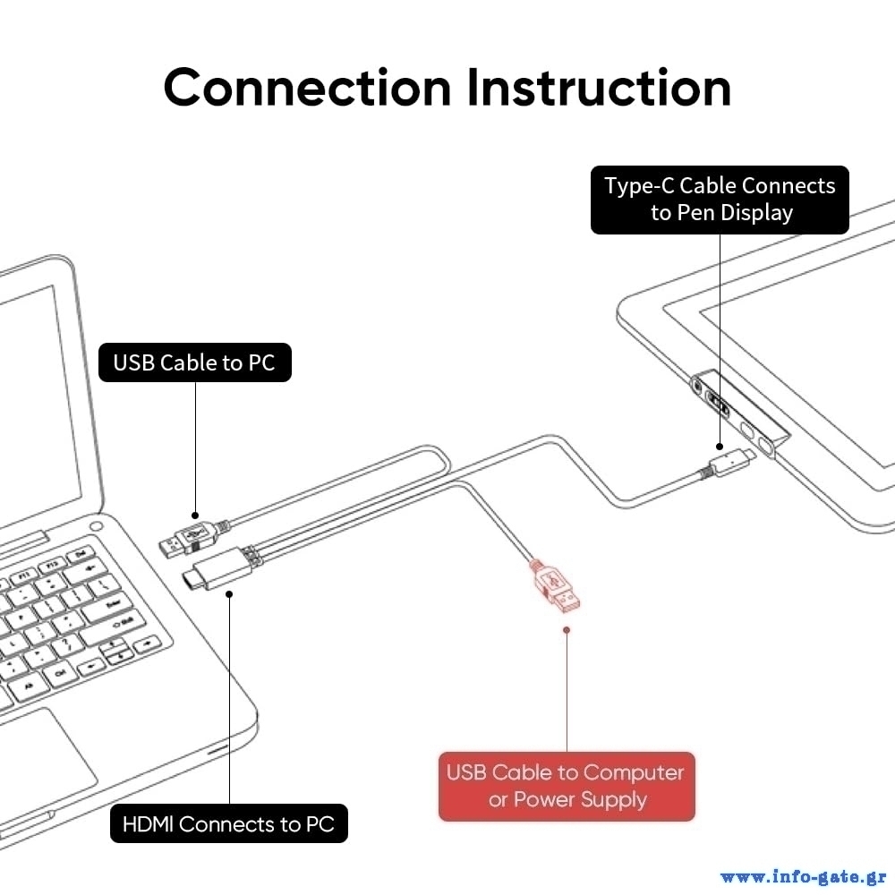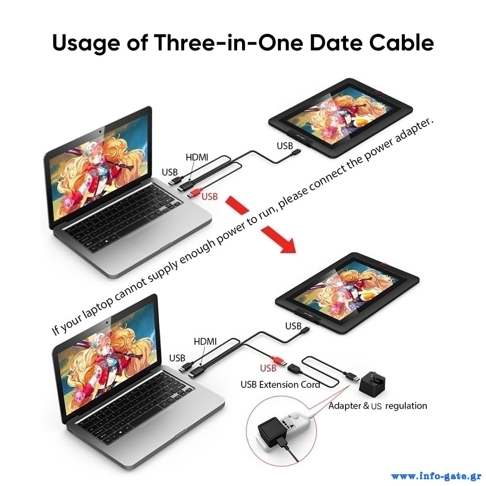 Καλώδιο 3 σε 1 από HDMI σε USB-C και 2x USB, κατάλληλο για την σύνδεση ταμπλετών σχεδίασης της XP-PEN με desktop ή laptop.