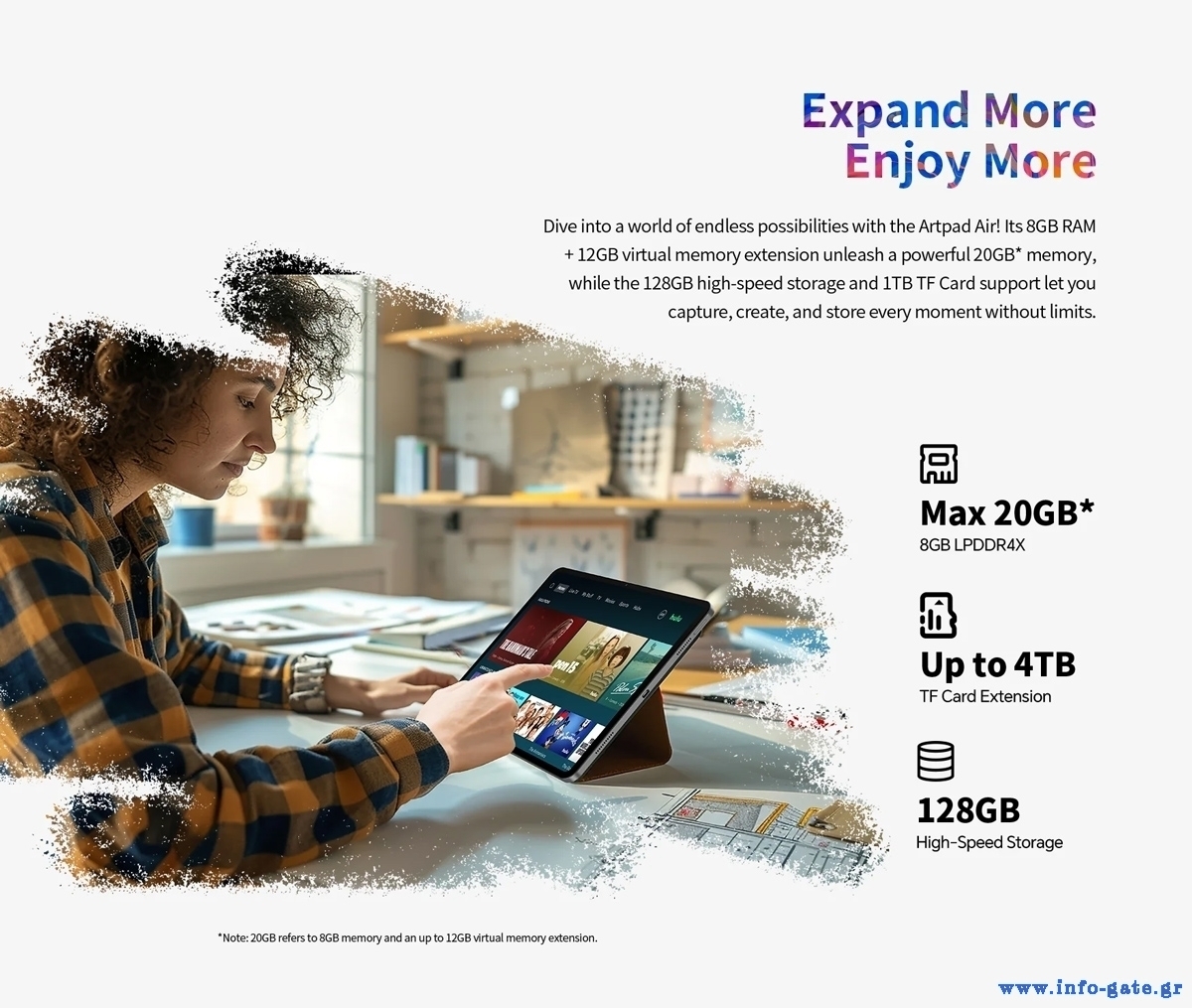 Με 8GB (+12GB virtual) RAM και 128GB ROM για να αποθηκεύετε τα αγαπημένα σας αρχεία, φωτογραφίες και βίντεο. Επιπλέον, προσφέρει την δυνατότητα να επεκτείνετε τον χώρο αποθήκευσης του tablet με κάρτα micro SD έως 4TB.