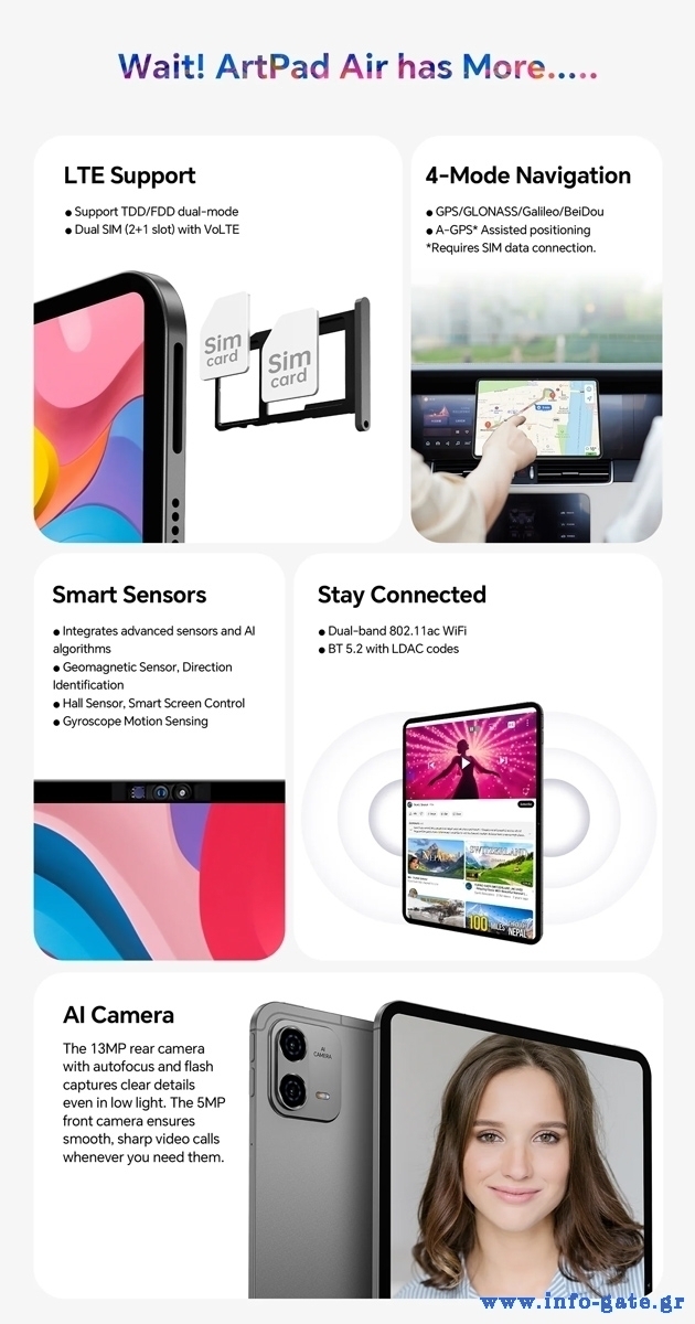 Με υποστήριξη διπλής κάρτα SIM και δικτύου 4G, το tablet ArtPad Air σας επιτρέπει να παραμείνετε συνδεδεμένοι όπου κι αν βρίσκεστε. Επιπλέον, η τεχνολογία WiFi σας εξασφαλίζει γρήγορη και αξιόπιστη ασύρματη σύνδεση.